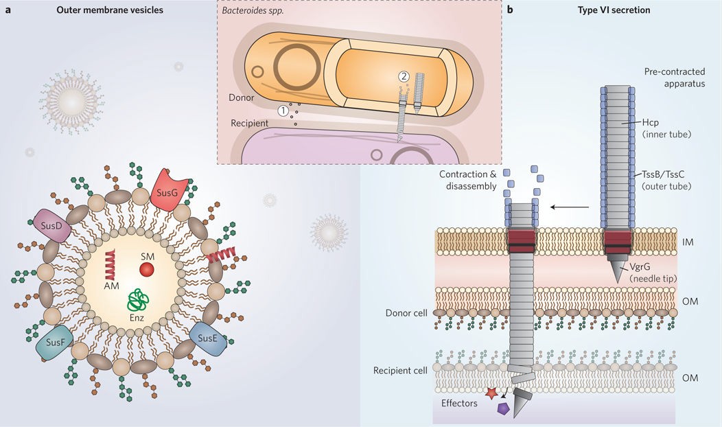 肠道中的高细菌密度可能会显著增强邻近细胞之间的资源竞争。许多肠道拟杆菌门似乎找到了减少非遗传同一细胞之间对共享资源的局部竞争的方法,部分是通过使用VI型分泌系统(T6SSs)。这些多蛋白机器在直接细胞接触后,迅速将称为效应物的抗菌毒素注入邻近细胞。拟杆菌门的T6SS在进化上不同于研究较深入的变形菌门的T6SS,并共同分为三种不同的结构类型。