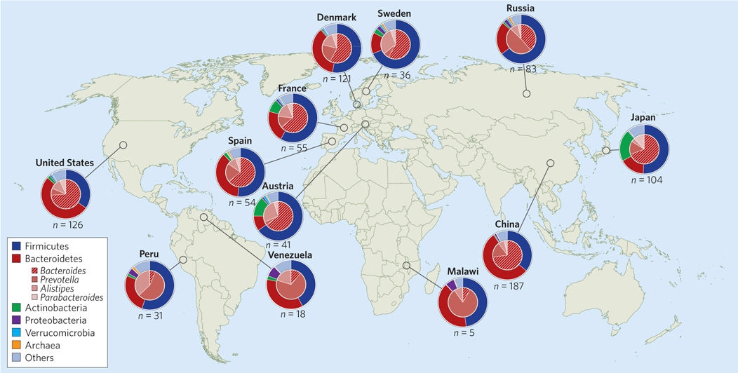 在健康成人人群中,革兰氏阳性菌厚壁菌门和革兰氏阴性菌拟杆菌门普遍存在。尽管不同人群的微生物群在门水平上可能相似(如瑞典与俄罗斯),但在更低的分类水平上往往差异显著。本图中每个饼图代表一个队列的平均值,外圈代表门水平分类,内圈代表拟杆菌门内的属水平分类。同一国家内个体间差异也很显著。