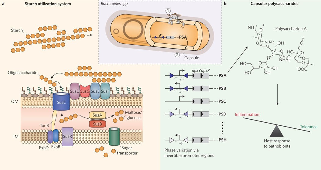 a, 淀粉利用系统:外膜上的淀粉结合脂蛋白(SusDEF)结合并固定大的胞外淀粉聚合物,然后由α-淀粉酶SusG将其分解为较小的寡糖。TonB依赖性转运蛋白SusC将这些寡糖转运到周质空间,随后α-淀粉酶SusA和α-葡萄糖苷酶SusB将其进一步分解为二糖(麦芽糖)或单糖(葡萄糖),通过糖转运透酶进入细胞质。周质空间中麦芽糖的存在触发调节蛋白SusR促进更多Sus组分的表达。拟杆菌基因组中通常编码80多个PULs。b, 荚膜生物合成与宿主保护:拟杆菌(如脆弱拟杆菌)的荚膜多糖生物合成受可逆启动子区域(倒三角)、反式位点抑制子(UpxZ)和顺式作用转录抗终止子(UpxY)调控。多糖A可以促进对肝螺杆菌等条件致病菌的免疫耐受,从而保护宿主免受病原体诱导的结肠炎。