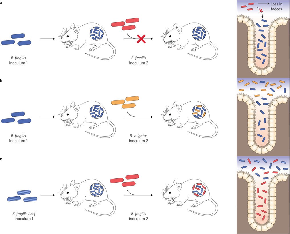 a, 定植排斥:用脆弱拟杆菌稳定定植无菌小鼠可阻止同基因脆弱拟杆菌姐妹细胞随后的定植,表明最初的脆弱拟杆菌种群已占据其所有可用生态位,不受随机位移力的影响。b, 共定植:用脆弱拟杆菌稳定定植无菌小鼠不阻止其他拟杆菌种的入侵,表明两种菌之间生态位重叠有限。c, 生态位位移:用缺乏称为共生定植因子(CCF)的特殊PUL基因的脆弱拟杆菌突变体稳定定植无菌小鼠后,可被随后定植的野生型脆弱拟杆菌细胞破坏。脆弱拟杆菌CCF突变体在定植结肠隐窝深处方面存在缺陷,隐窝被认为是播撒肠腔并促进肠道长期定植的微生物储存库。