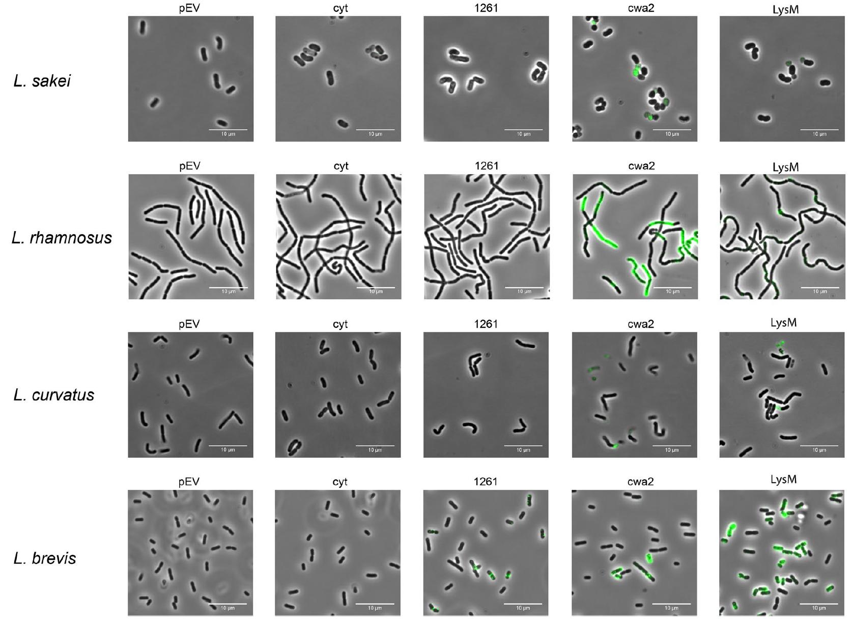 诱导后3小时收获细胞。pEV,空载体菌株;cyt,胞内表达载体菌株;lipo、cwa2和LysM,携带不同表面锚定表达质粒的菌株。结果显示清酒乳杆菌、鼠李糖乳杆菌、弯曲乳杆菌和短乳杆菌的表面展示情况。