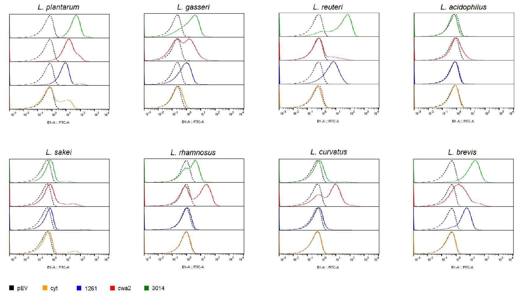 诱导后3小时收获细胞。pEV,空载体菌株(黑色虚线);cyt,胞内表达载体菌株(黄色);lipo(蓝色)、cwa2(红色)和LysM(绿色),携带不同表面锚定表达质粒的菌株。结果显示,除嗜酸乳杆菌外,其他菌株均检测到不同程度的表面展示信号。