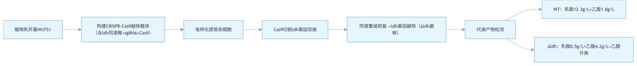 案例一:CRISPR-Cas9 介导的乳酸菌乳酸脱氢酶基因敲除 —— 代谢通路重构研究