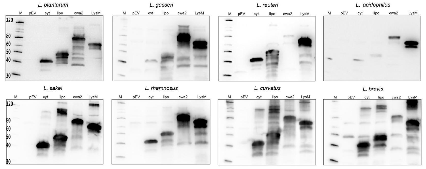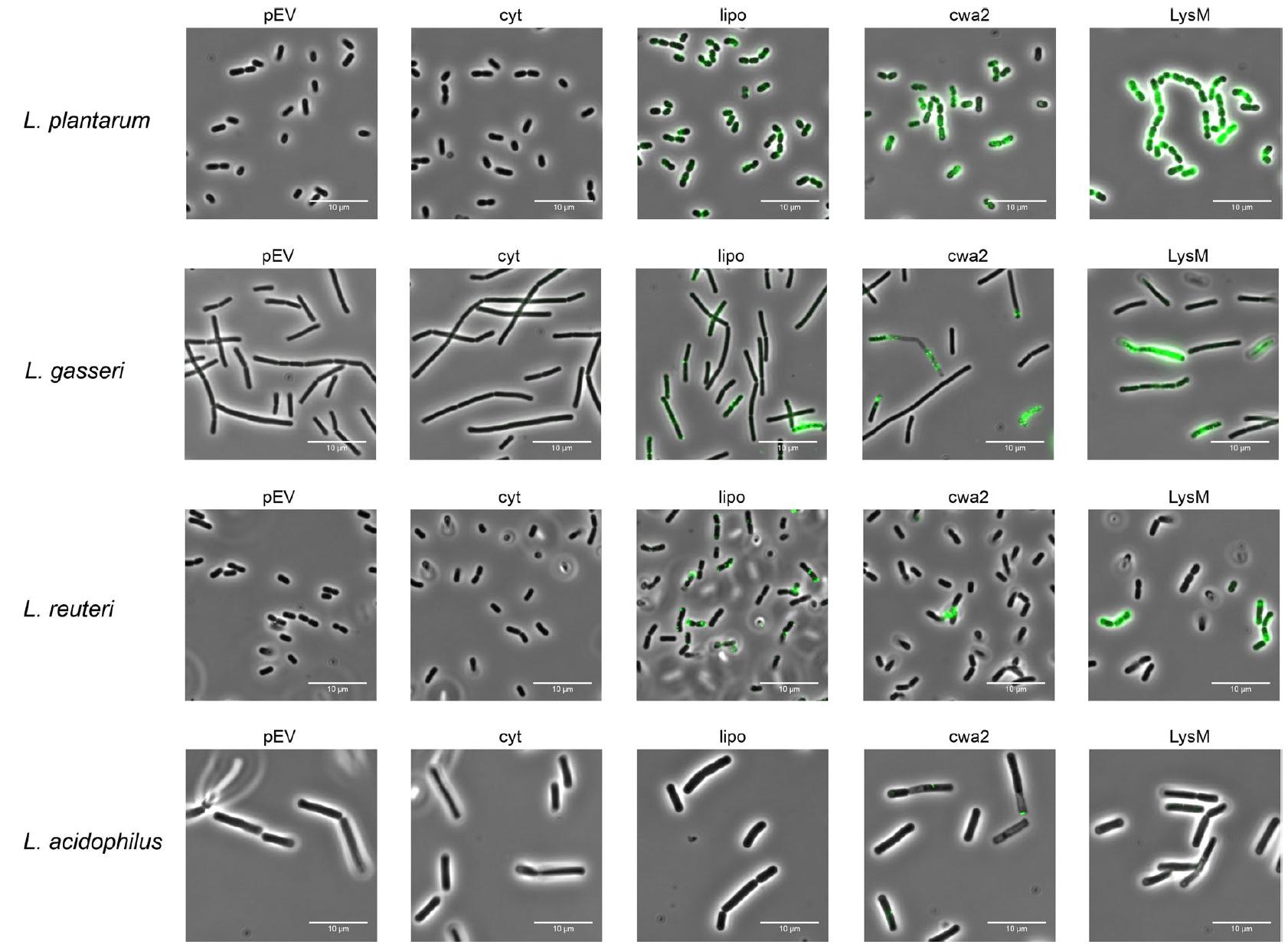 - 脂蛋白锚定:效果变化较大,在植物乳杆菌、加氏乳杆菌、罗伊氏乳杆菌和短乳杆菌中成功,但在其他四种菌株中信号微弱或无信号。