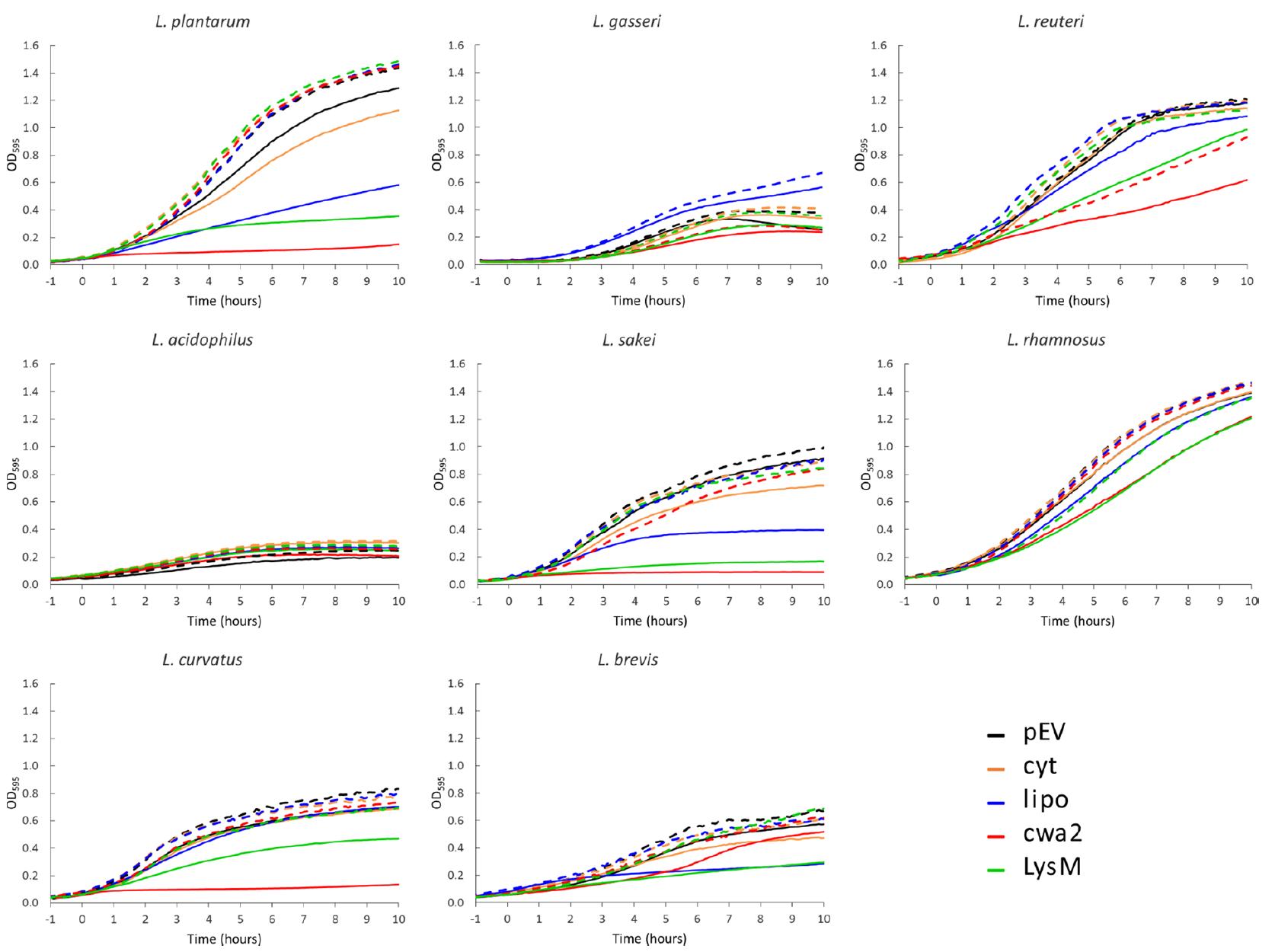 携带胞内表达(cyt)或表面展示(lipo、cwa2、LysM)AgE6-DC质粒的乳杆菌,以及携带空载体(pEV)的菌株,在诱导(实线)或不诱导(虚线)基因表达条件下的生长曲线。结果显示,分泌型抗原的表达普遍降低生长速率,而胞内表达影响较小。